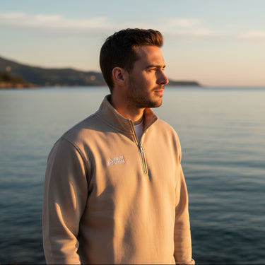 Dieses Unisex Quarter-Zip-Sweatshirt kombiniert zeitloses Design mit funktionalen Details. Der Mock-Neck-Kragen aus Eigenstoff und der hochwertige Front-Reißverschluss sorgen für einen cleanen, modernen Look. Wir bieten bei dem Sweater eine optimale Passform und langlebige Qualität. Innenliegende Details wie das Fischgrätenband am Nacken und am Reißverschluss sowie der Eigenstoff-Halbmond runden das hochwertige Finish ab.